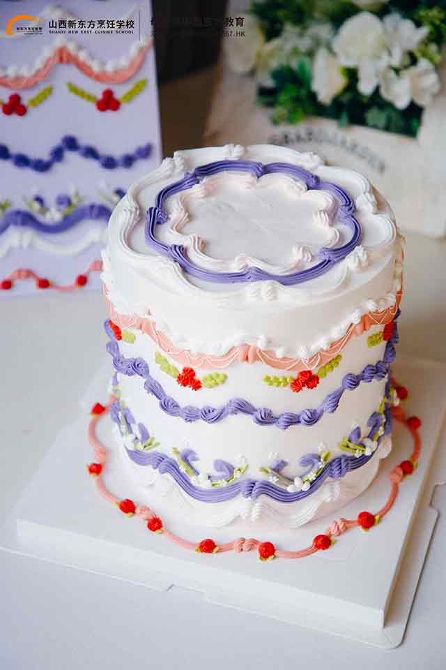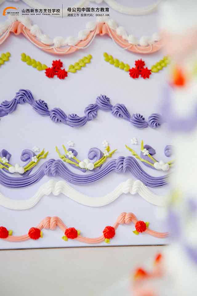 課堂伊始,沒有冗長的理論灌輸,實操訓練便是核心。裱花臺上,裱花嘴、裱花袋、轉臺、抹刀等工具擺放整齊,打發(fā)至細膩綿密的奶油散發(fā)著清甜香氣,學子們身著統(tǒng)一工裝,凝神專注于眼前的練習板;A花邊練習是裱花的入門必修課,也是筑牢技能的根基,山西新東方的課堂上,貝殼邊、波浪邊、祥云邊、毛毛蟲邊、辮子邊等十余種花邊技法,都是學子們反復錘煉的內容。