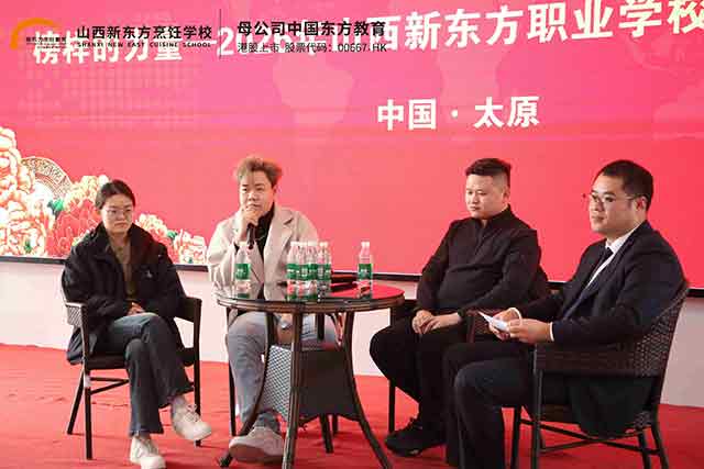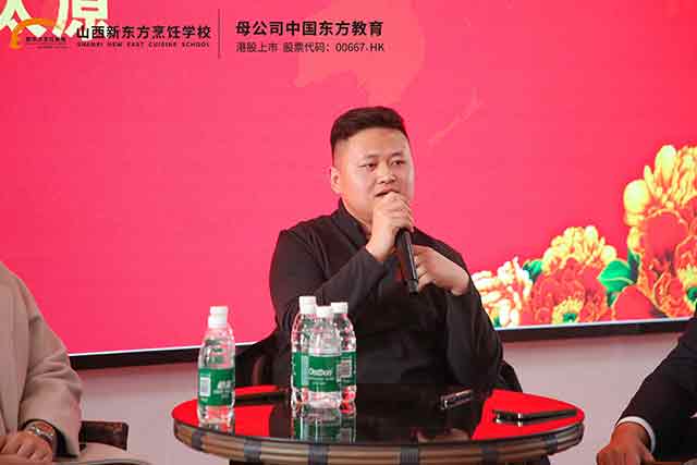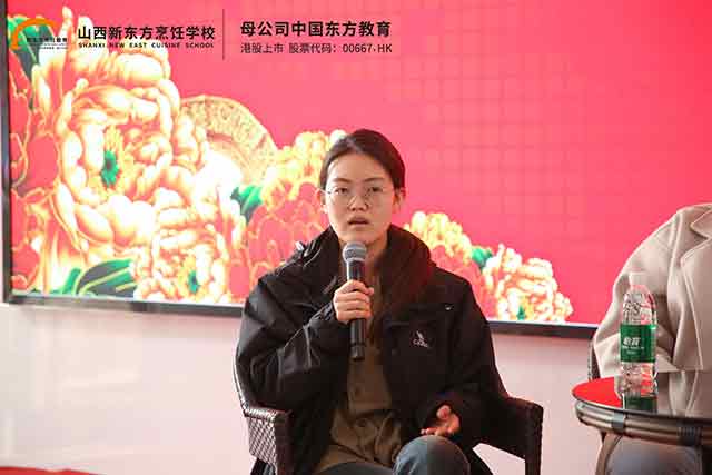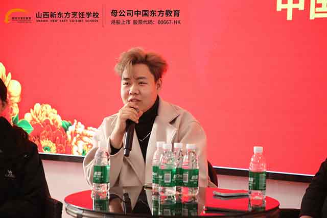 分享會上,張佳鑫學(xué)長率先分享成長歷程。作為烹飪精英專業(yè)畢業(yè)生,他從灶臺起步,憑借扎實的烹飪功底與出色的管理能力,一路晉升為杰的廚房運(yùn)營總監(jiān)。他坦言,在山西新東方的學(xué)習(xí)時光,是人生最重要的起點——系統(tǒng)化的烹飪課程、手把手的實操教學(xué)、沉浸式的實訓(xùn)場景,讓他從零基礎(chǔ)掌握熱菜、冷拼、宴席設(shè)計等核心技能,更培養(yǎng)了餐飲運(yùn)營思維。他叮囑學(xué)弟學(xué)妹:技能是立身之本,堅持是成功之基,把每一次實操練到極致,把每一個細(xì)節(jié)做到完美,職場自然會給你回報。
