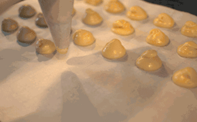 ➋成型:將泡芙糊裝入袋中,按不同需要選擇不同的裱花嘴,裱入鋪有烤盤紙的烤盤中,形狀可以是圓型、長條形等。