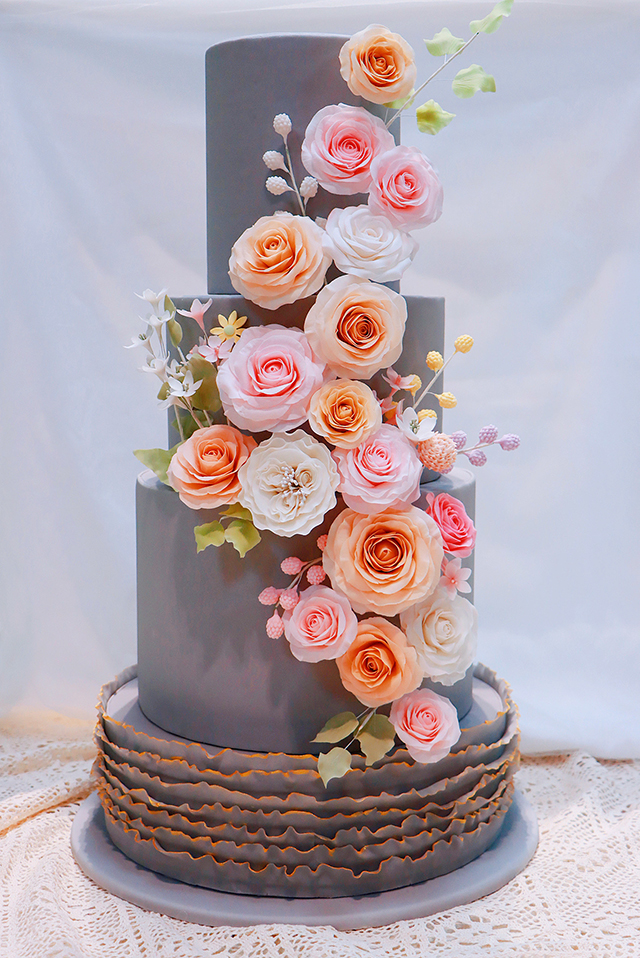 看著一朵朵色彩艷麗的糖花,陣陣糖香撲鼻而來,如畫一般的造型,色彩的平衡,精美的飾品,充分體現(xiàn)了個(gè)性與藝術(shù)的完美結(jié)合,一件完美的翻糖蛋糕不僅要求翻糖師有精湛的工藝,獨(dú)立設(shè)計(jì)造型的能力,更是離不開翻糖師的匠心營(yíng)造,制作翻糖蛋糕的每一個(gè)環(huán)節(jié),都飽含著翻糖師傾注的心血,以及想傳遞給他人的甜蜜夢(mèng)想。