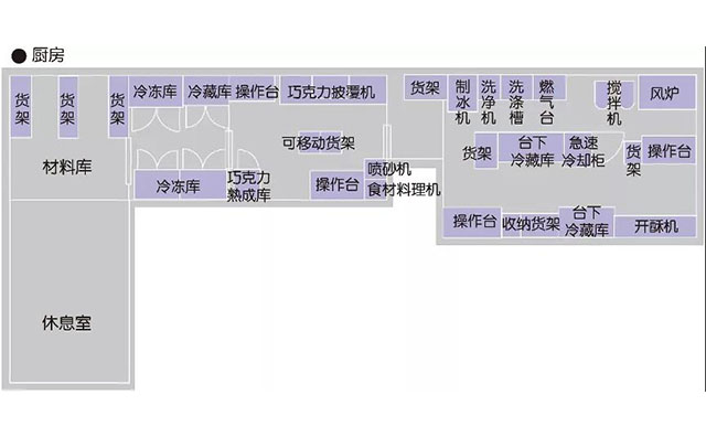 后區(qū)可細(xì)分為以下幾個(gè)功能區(qū):加工區(qū):烘焙現(xiàn)烤間、裱花操作間。休息區(qū):員工休息和更衣的區(qū)域。倉儲(chǔ)區(qū):儲(chǔ)存原料和成品的地方。清潔區(qū):儲(chǔ)存衛(wèi)生潔具和雜物。